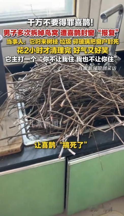 4月30日报道,山东青岛,男子多次拆鸟窝遭喜鹊封窗报复 :它叼来树枝、垃圾、碎玻璃把窗户封死,花2小时才清理完,好气又好笑。