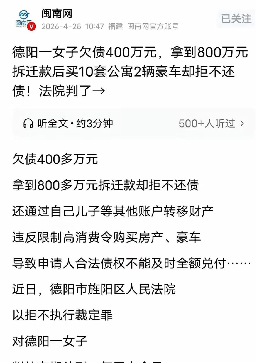 信息来源:潮新闻|女子欠债400万元,拿到800万元拆迁款后买10套公寓2辆豪车却拒不还债!法院:行为构成犯罪,判刑1年6个月
