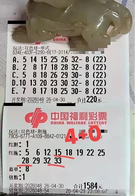 貔貅哥的复式票拿到了4+0,另一张1.6万的复式票拿下了5+0。这个成绩只算勉强及格。因为选择这么多号码,也猜对了明码思路,却没有抓住机会拿下6红。