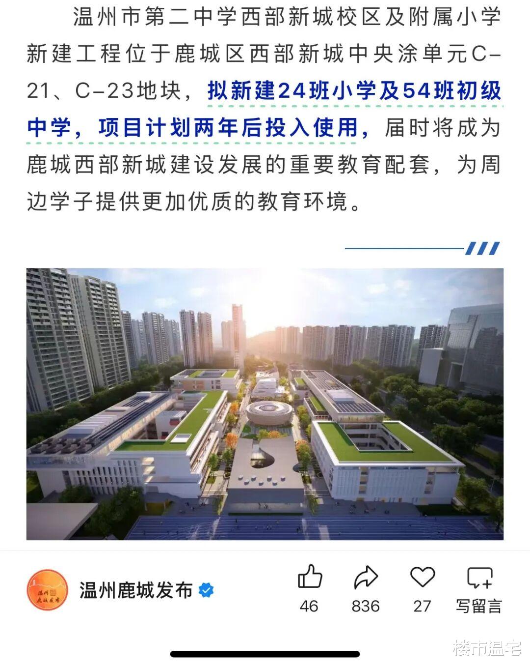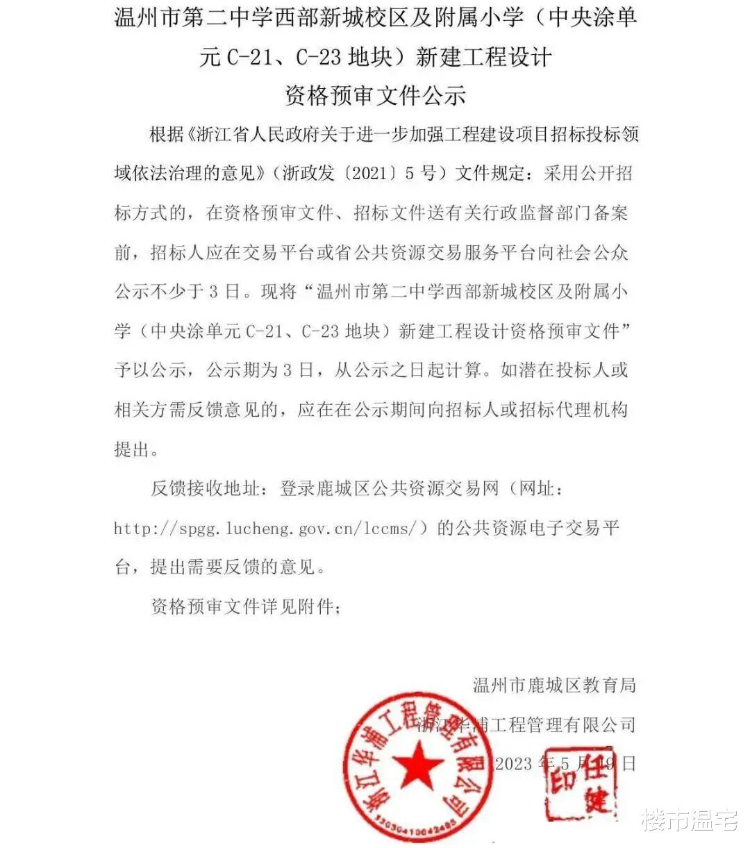 2024年10月,市自然资源和规划局官网发布温州市第二中学西部新城校区及附属小学(中央涂单元C-21、C-23地块)新建工程建设工程规划许可批前公示。
