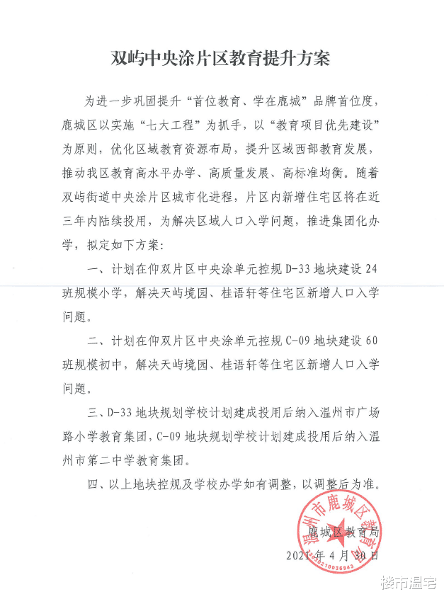 计划在仰双片区中央涂单元控规C-09地块建设60班规模初中,解决天屿境园(天境)、桂语轩(桂语江南)等住宅区新增人口入学问题。C-09地块规划学校计划建成投用后纳入温州市第二中学教育集团。