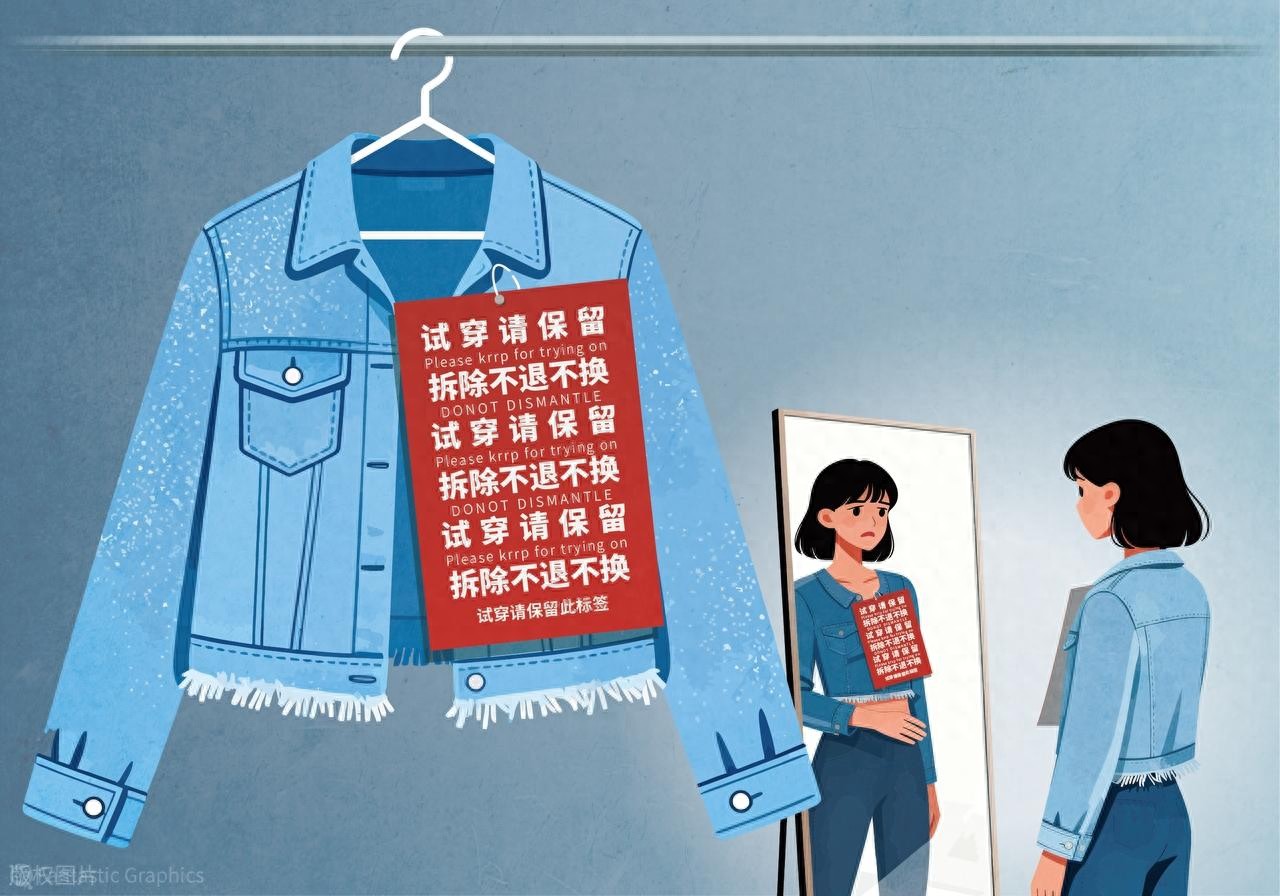 那吊牌大得近乎荒诞,像中古骑士的盾牌悬于颈下,硬质卡纸的边角硌着锁骨。试衣镜前的女子,想看清一条连衣裙的腰线走势,视线却被吊牌上硕大的Logo拦腰截断。她站在一个充满现代性悖论的岔路口:拆,则退货的资格随之消散;不拆,衣与人真正的合谋永远隔着一层坚硬的猜疑。