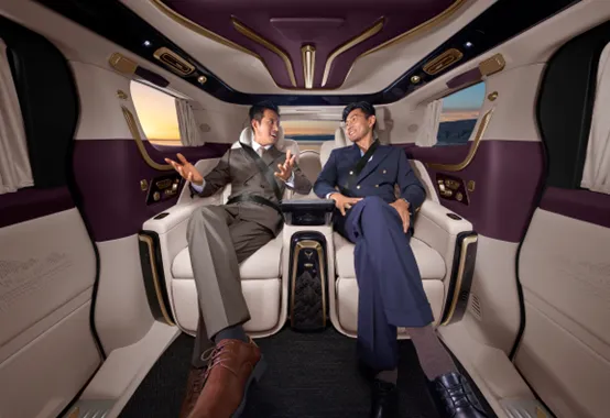 内饰采用天然影木与鎏金饰件,灵感来源于东方美学,寓意吉祥与稳固。座椅系统支持“山河云榻”模式,配合电动鞋履仓与零重力功能,形成可躺平的休憩空间。