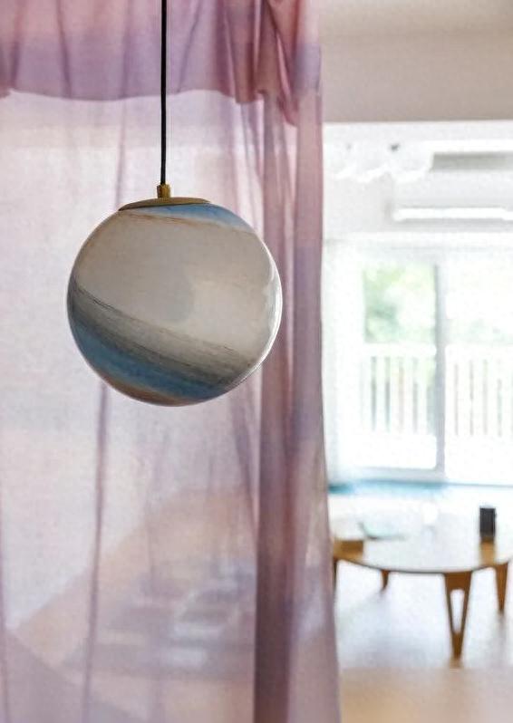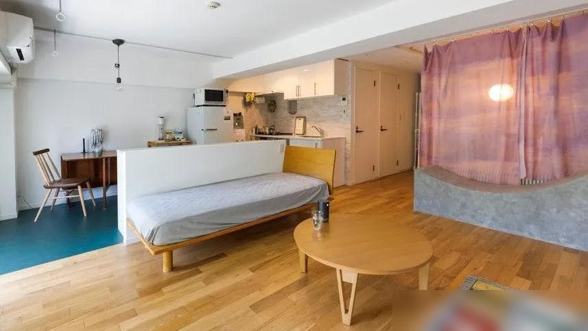 卧室用布帘代替门,是个大胆的选择。紫色帘子一挂,隐私有了,还多了点浪漫和随性的味道。省下做门的钱和空间,划算。卧室里东西少得可怜,就一张床一盏灯。但看那吊灯的描述,夜里亮起来,估计就是整个房间的灵魂。人到中年,反而开始喜欢这种“少即是多”的感觉,东西多了,心就乱了。