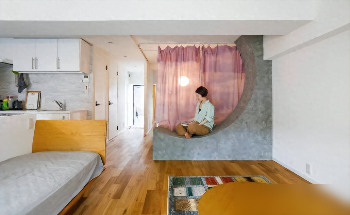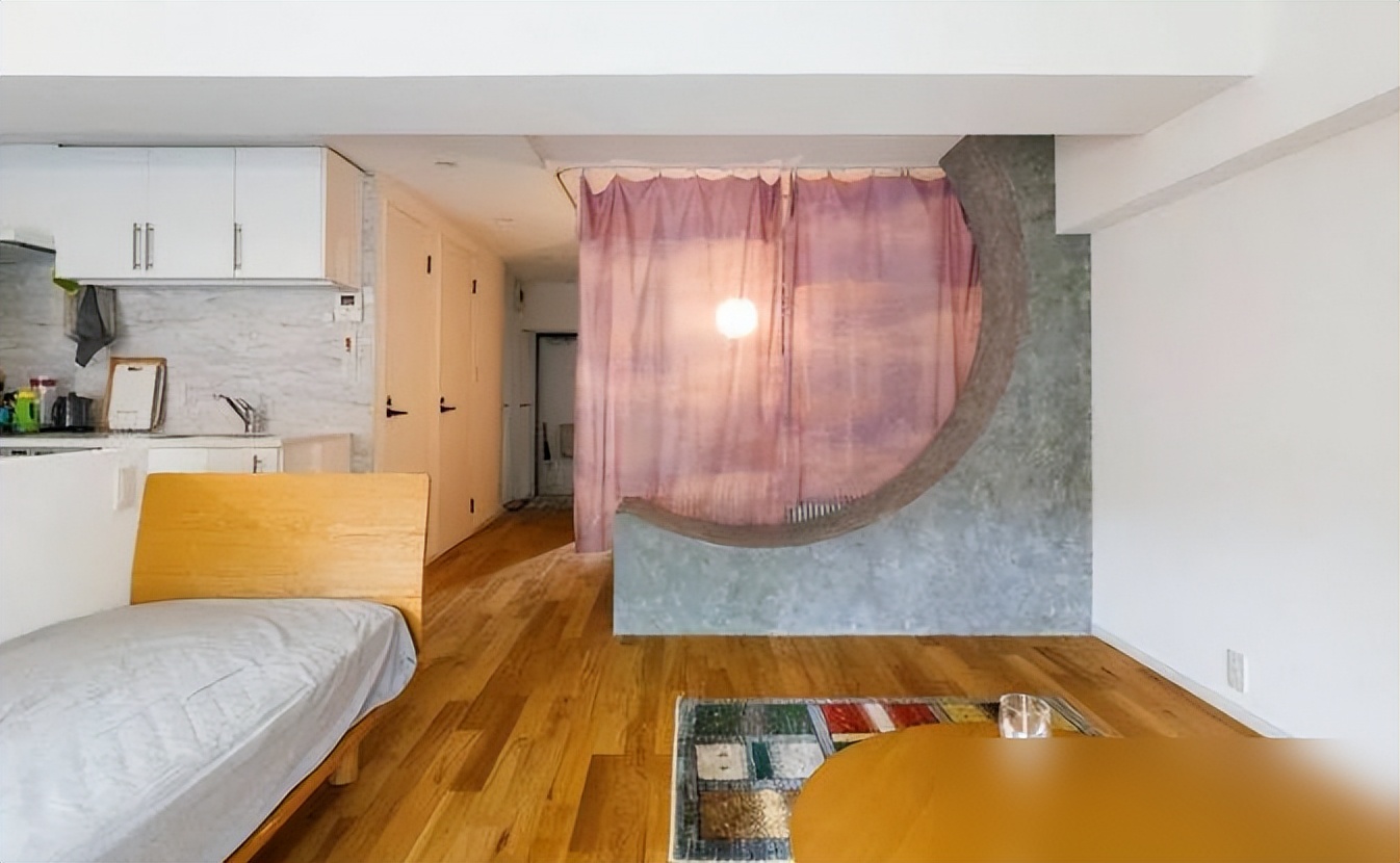 最绝的是那面“月亮墙”。半弧形,既是隔断,又能当椅子躺椅。这设计不光是为了好看,是真把每一平米都琢磨透了。小户型最怕死板的隔墙,白白浪费空间。这样一弄,客厅和卧室既分开了,又有联系,还多了一个可以瘫着发呆的角落。这种巧妙,不是那种华而不实的设计能比的。