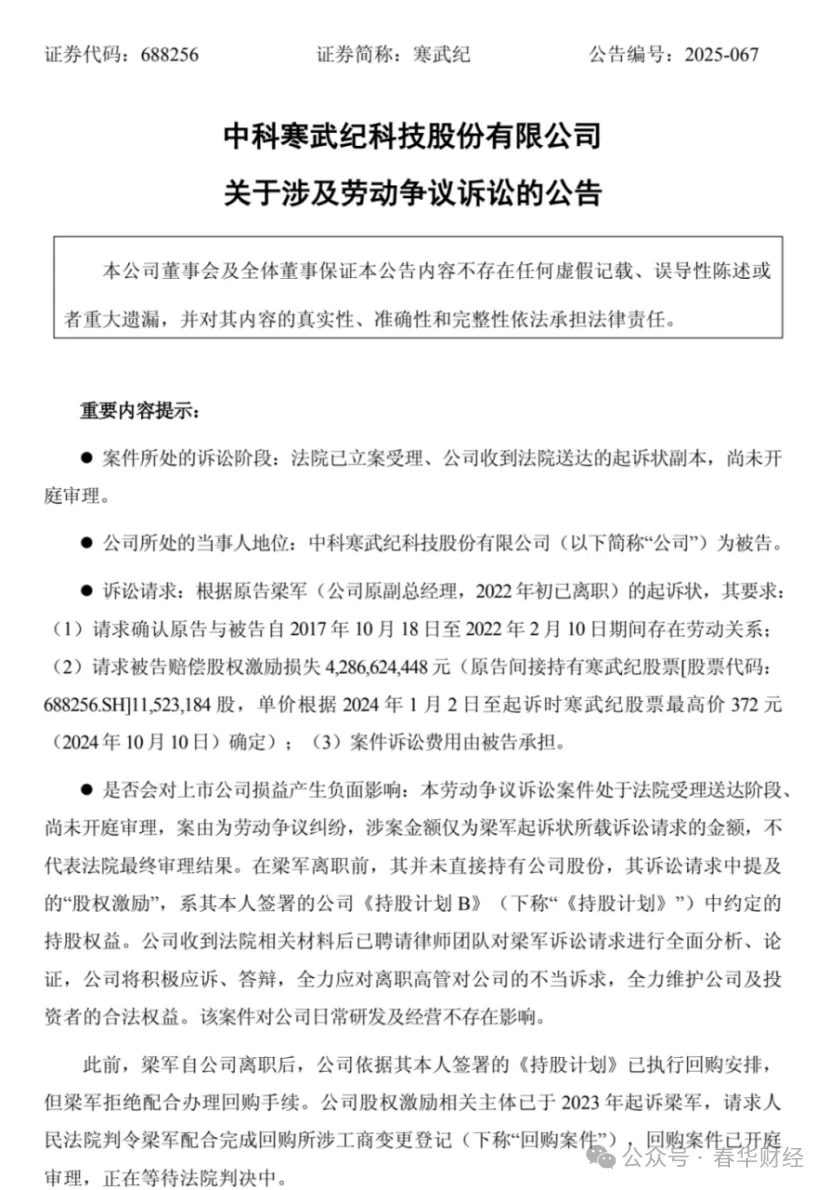 10月31日,寒武纪公告披露,公司原副总经理、首席技术官梁军提起诉讼,要求公司赔偿股权激励损失高达42.87亿元。