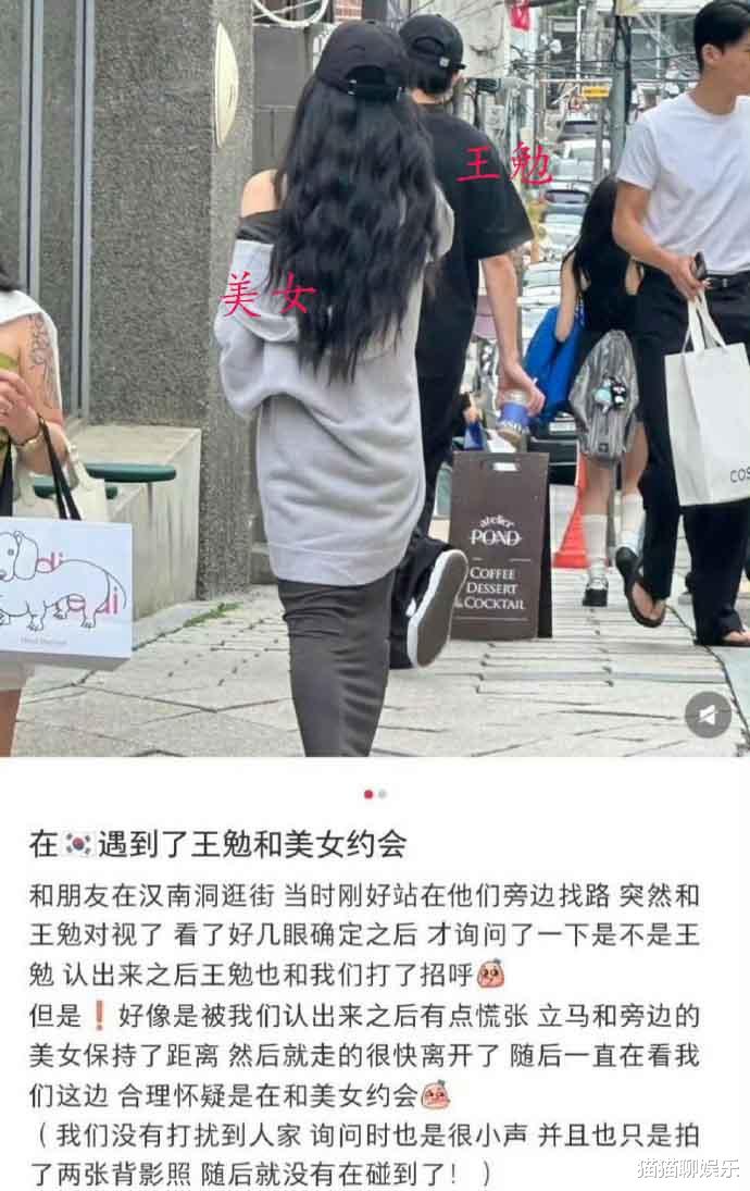 近日,有网友偶遇王勉,发现他和美女在韩国汉南洞约会逛街。最初,网友先是询问对方是不是“王勉”,而被认出来后的王勉还和网友打了招呼,并有点慌张的立马与身边美女保持了距离。