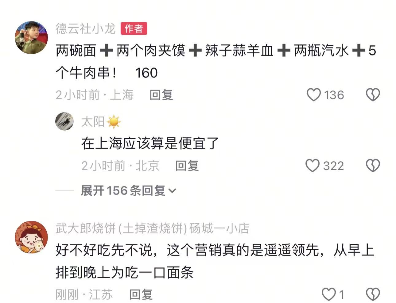 博主说他点了两碗面➕两个肉夹馍➕辣子蒜羊血➕两瓶汽水➕5个牛肉串!最后消费160元。但是在测评的时候,这位博主给出了很难吃的评价。就是说这些菜品没有什么让他觉得满意的。所以一直在说一般一般,还有价格很贵。可以说这也是那么多探店当中,唯一一个说面馆不好吃的博主了。