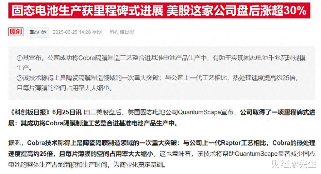 Cobra的热处理速度比上一代提高约25倍,同时大大减小了薄膜的空间。该技术能够显著提高固态电池的效率。受此消息影响,6月25日美股QuantumScape盘中一度涨幅超过46%