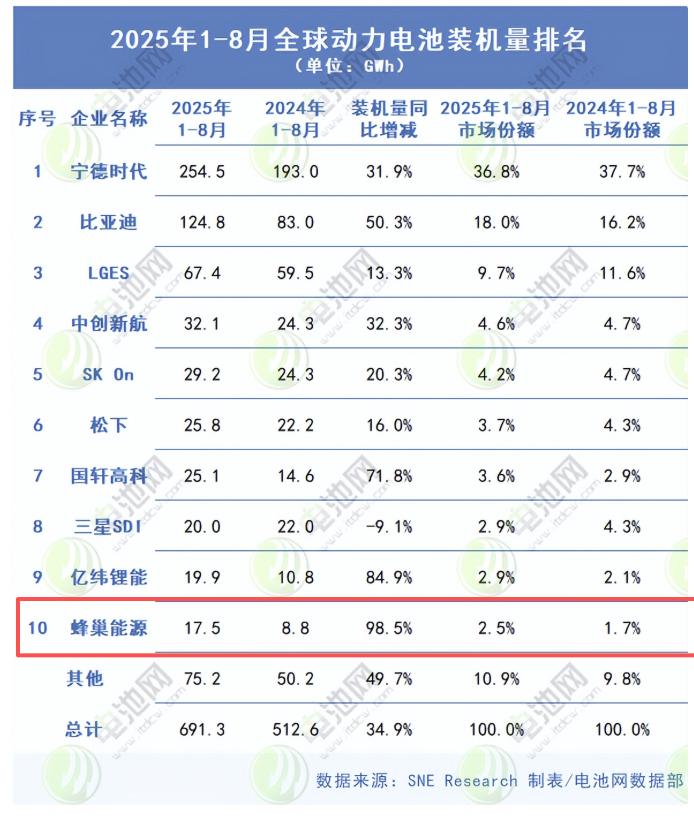 根据韩国研究机构SNE Research最新数据,2025年1-8月,蜂巢能源海外动力电池装车量达5.4GWh,同比大幅增长593.4%,增速高居全球主流电池企业榜首,并跻身海外市场装车量排名前十。与此同时,其全球总装机量达17.5GWh,同比增长98.5%,成功进入全球动力电池装机量前十阵营,成为增长最快的行业“黑马”。