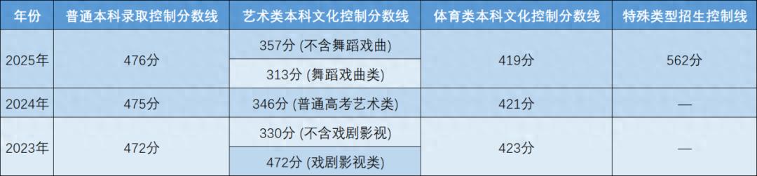 普通本科线:476分。艺体类本科线:艺术类(不含舞蹈、戏曲)357分;舞蹈、戏曲类313分;体育类419分。特殊类型线:562分(适用于强基计划、高校专项等特殊类型招生资格)。2024年情况