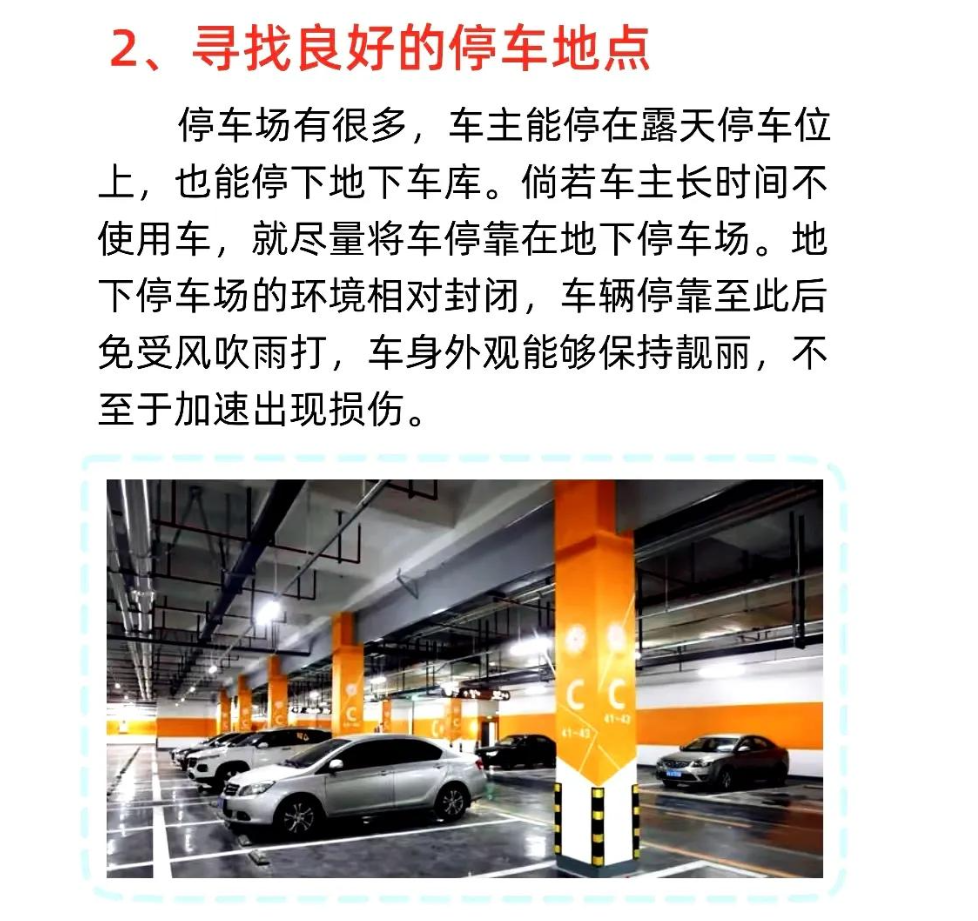 第二是要找一个靠谱的停车地点,如果有地下室那是最好的,会让车辆几乎不会受到损害,但绝大多数没有这种条件,那就选择有树荫的地方,但千万不要找没有任何遮蔽物的地方。