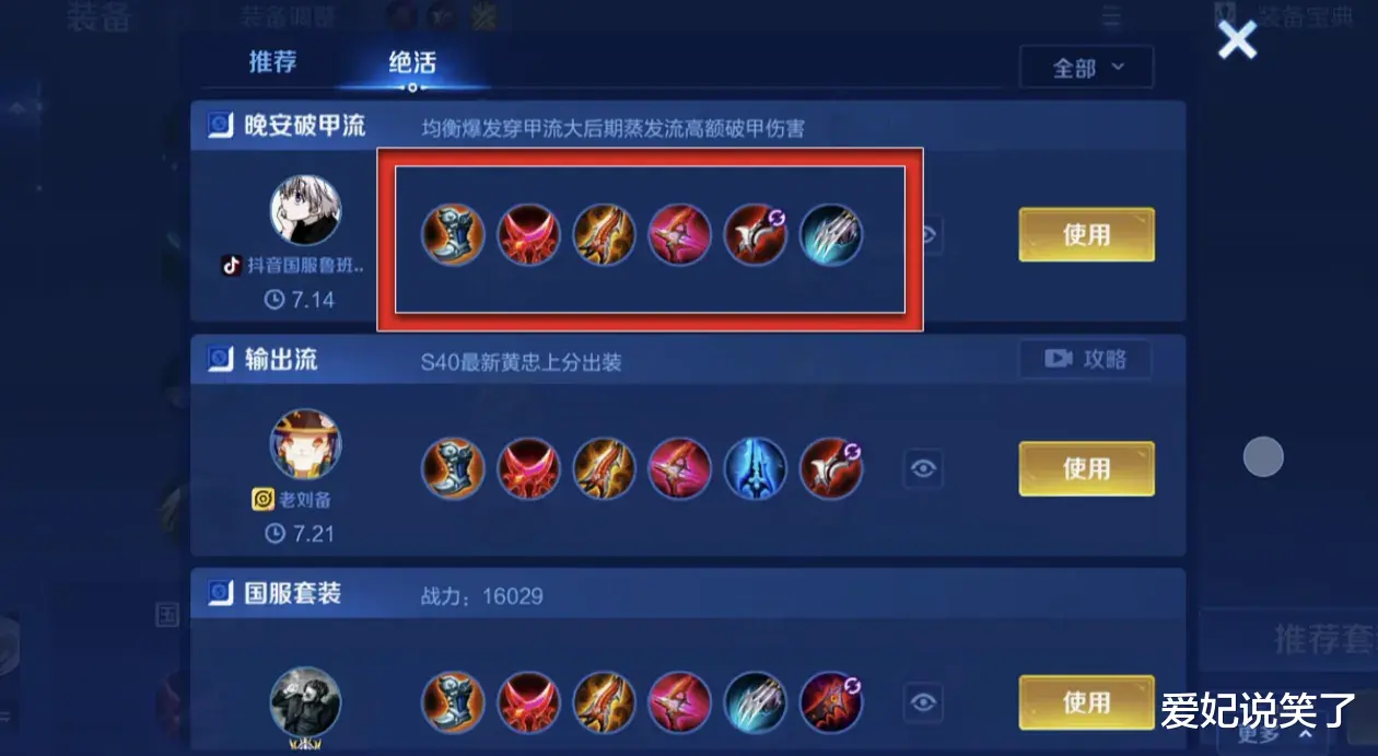 首先黄忠的出装比较统一,没什么好说的,你就选择这一套,到了后期可以把攻速鞋换成抵抗鞋,又或者说直接换成一件肉装。