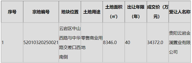 在住宅用地方面,花溪区贵筑街道办事处尖山村地块(编号52011120240218)以8.28亿元的成交价成为本次出让的"标王",该地块面积达132420平方米,由贵阳花溪宾远置业有限公司竞得。