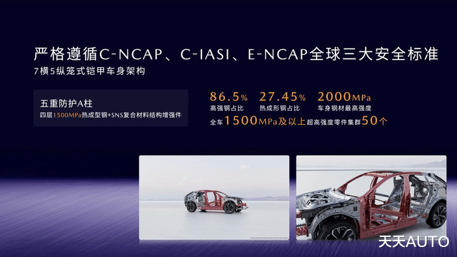 卓越的碰撞成绩来自于车身结构的创新。EZ-60采用7横5纵的笼式铠甲结构,高强钢占比86.5%,热成形钢27.45%,最高强度2000MPa,全车1500MPa及以上超高强度零件集群50个,关键部位更是层层加码,如A柱采用五重防护结构,内外双层1500MPa热成型钢和腔体SNS复合材料,大幅增强A柱的钣金强度和刚度,抗弯性能提升44%。