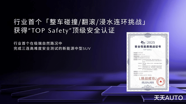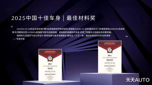 安全是马自达刻在骨子里的DNA,是所有驾乘愉悦的前提。EZ-60通过“实战测试+权威认证”双维度,树立了新能源中型SUV安全领域的新标杆,为用户的每一次出行保驾护航。9月,EZ-60在“勇士之路”丙察察成功完成行业首个“整车碰撞/翻滚/浸水”连环挑战,并荣获中汽中心颁发的“TOP Safety”顶级安全证书,展现出卓越的安全性能。同月再次斩获“2025中国十佳车身”及“最佳材料奖”两项大奖。