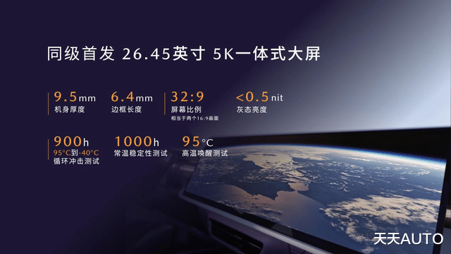 26.45英寸5K一体式大屏,画幅比例32:9,全面适配视频资源播放要求。5K屏幕分辨率同级最佳,显示屏灰态亮度小于0.5nit。此外,大屏经过900小时零下40°到95°循环冲击测试,1000小时的常温稳定性测试,95°高温唤醒测试,好用更耐用。为了保证绝佳的屏幕观感,还采用了大视角补偿膜技术。