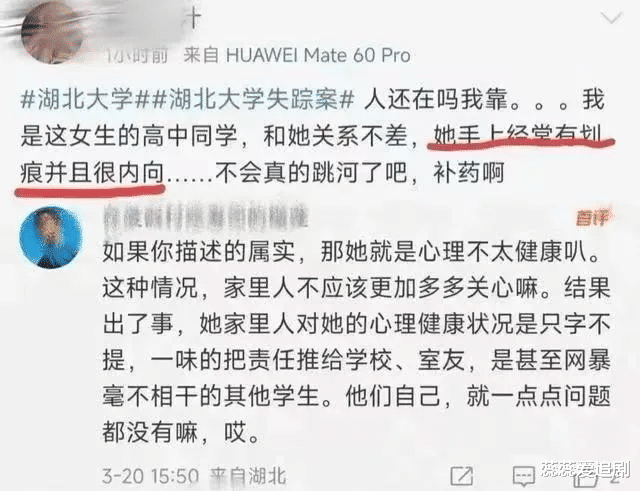 其次家长就一点儿也感知不到自己的孩子发生了心理上的问题吗?我真服气了现在的有些家长,把孩子当成累赘,只要扔到学校好像就与自己不相干了,那是自己的孩子啊,即使长大又怎样,必须等到悲剧发生才痛不欲生的去悔恨吗?管啥用?这件事里,学校也许只能进行人道主义的补偿,而家长只剩下悔不当初了,母亲不接受孩子的离世又如何,已经成为了事实,怪自己吧。我家就在湖北大学附近,网上都在无端猜测湖北大学女学生溺水事件,实则是无良自媒体,利用女孩儿母亲的悲痛来炒作,拉流量。女生为什么在废弃小屋脱掉羽绒服,为什么留下手机?有人说是被谋害,真是智商无下限,有这么笨的水分子嘛,案现场还要留下手机?