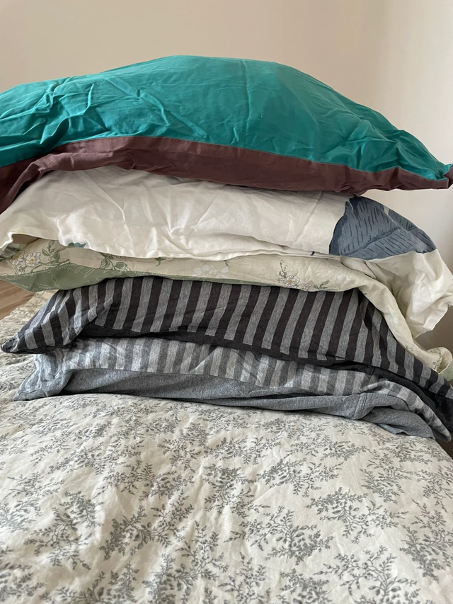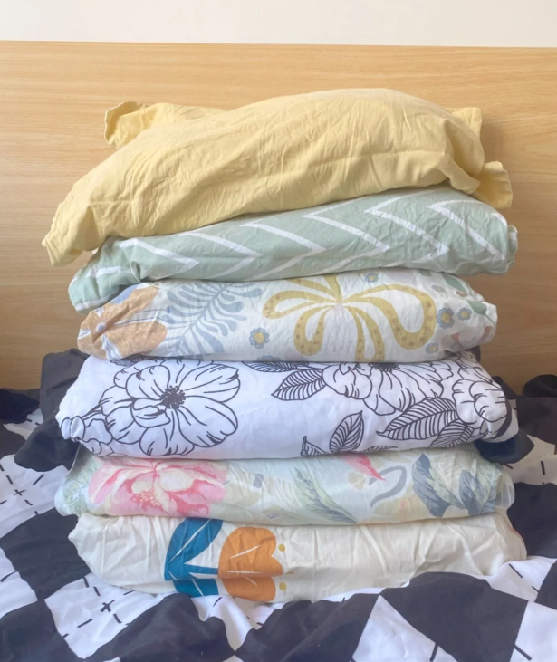 那就是用四件套的枕头套来收纳四件套,方法是不是超级的简单,而且这样每次拿取时我可以一目了然的看到我想要的那件四件套啊。