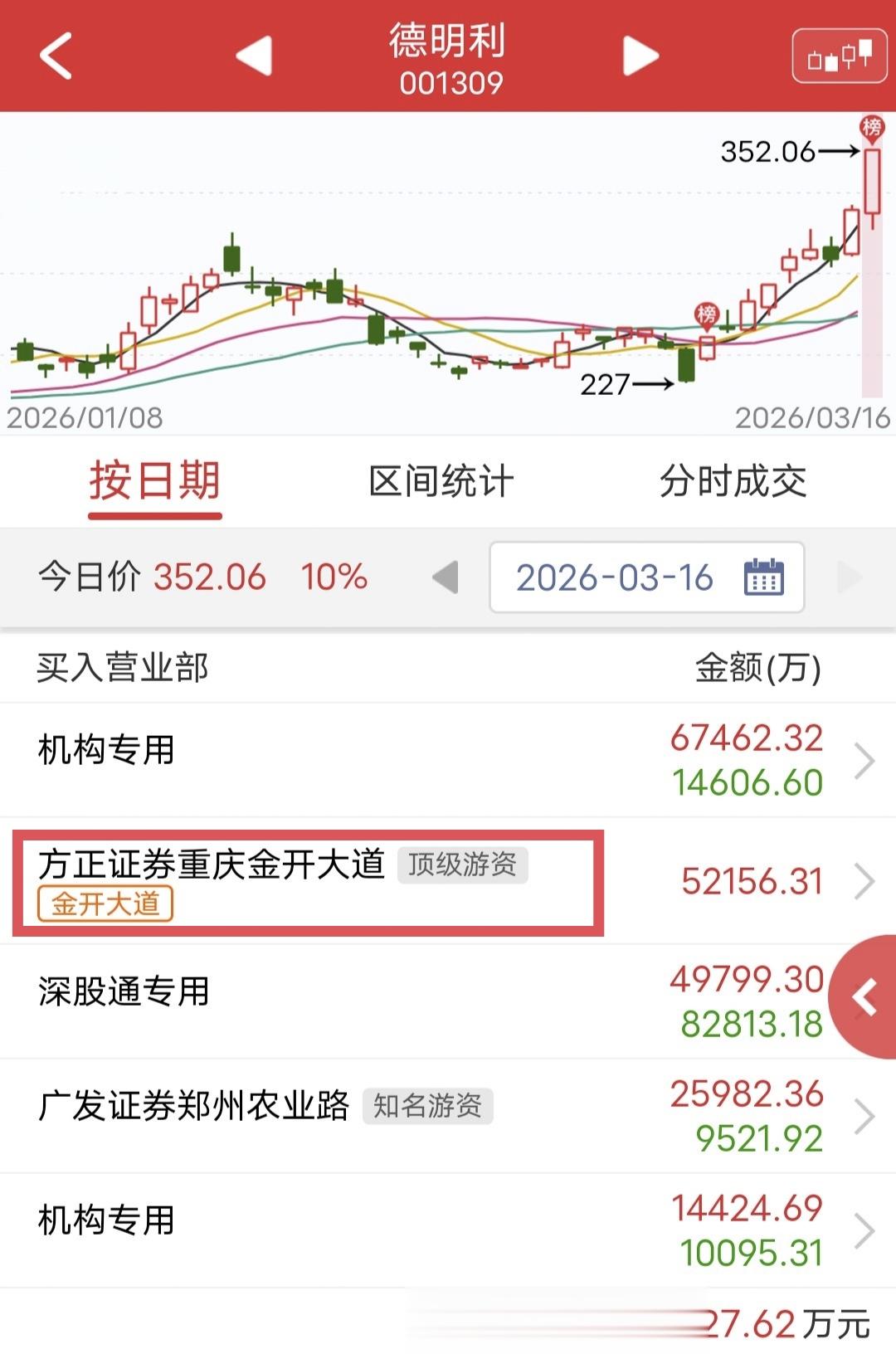 周一德明利大涨,可惜这票最终还是没能封住涨停。盘后龙虎榜显示,金开大道爆买5.2个亿,终于又看到游资相对大手笔的出手。