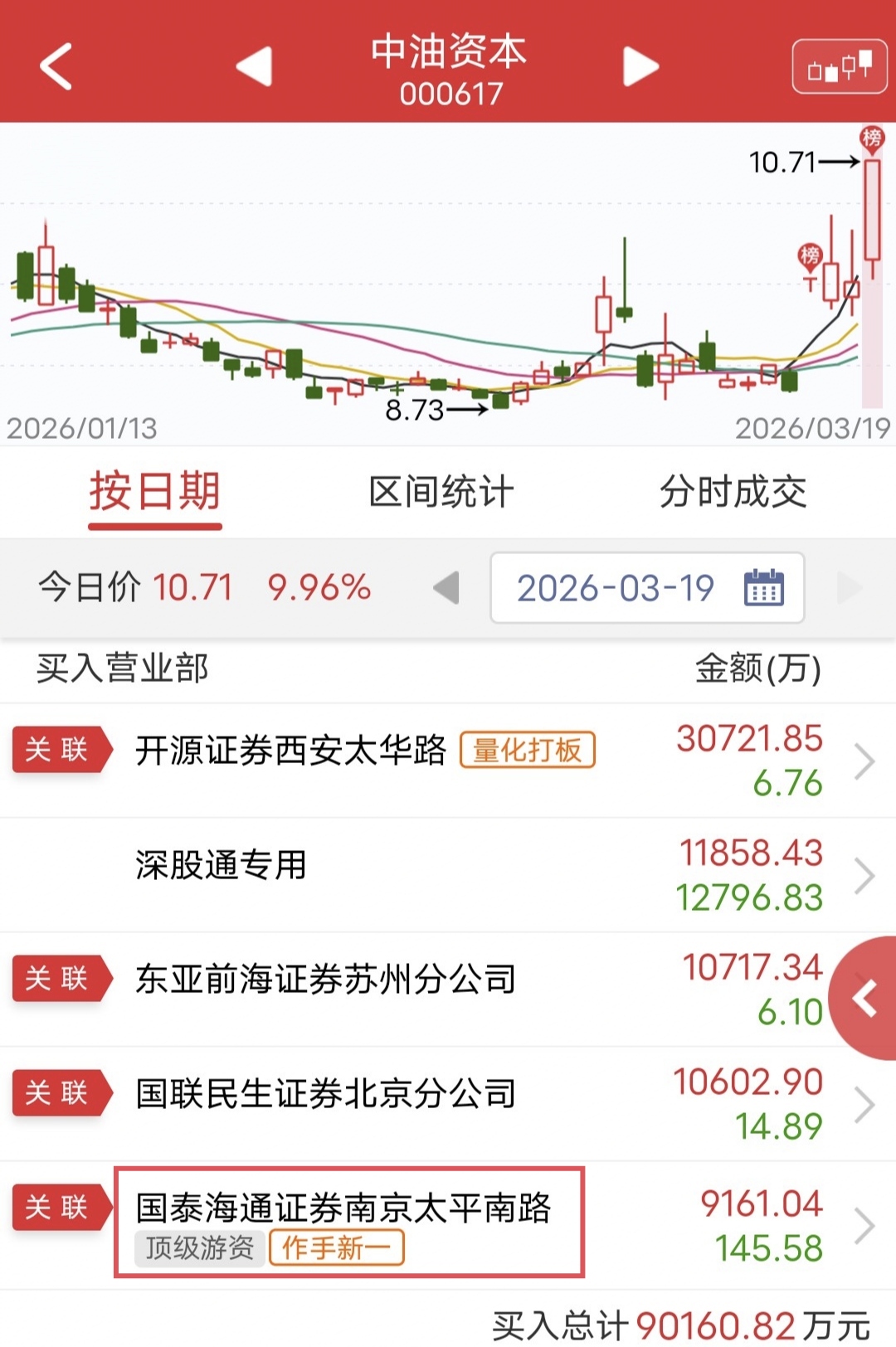 周四中油资本盘中涨停,盘后龙虎榜显示,作手新一买入9100万。从分时图看,刚好买在了起爆点,牛啊!
