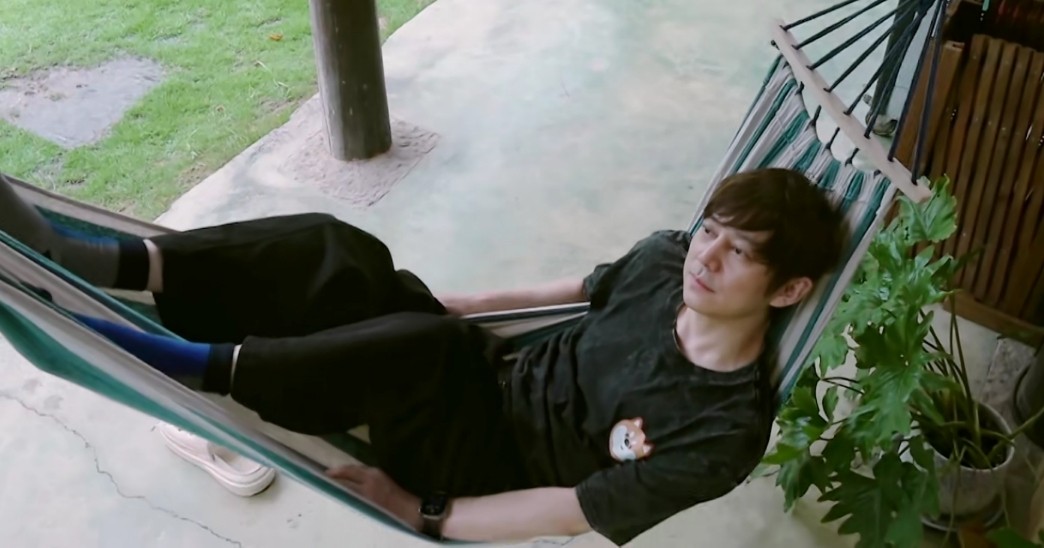但当镜头转到何炅时,躺在吊床上的何炅,就像是干活累了一天,身体乏到不行的中老年。