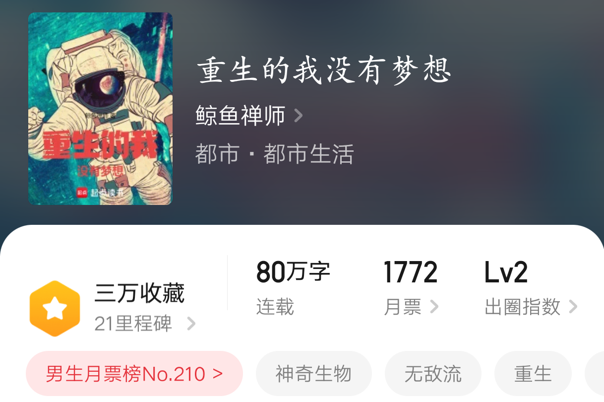 推荐喜欢都市重生,顺便带点关心时事的乐子人属性读者前去阅读……以及想看最好抓紧时间,保不齐啥时候这本书又被作者浪没了呢。