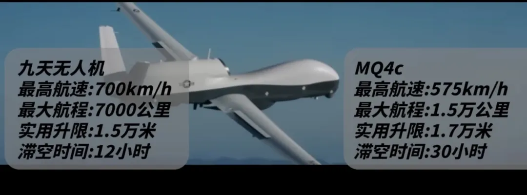 最高航速:约 700 公里/小时最大航程:约7000 公里使用升限:1.5 万米滞空时间:12 小时而 MQ-4C 全球鹰: