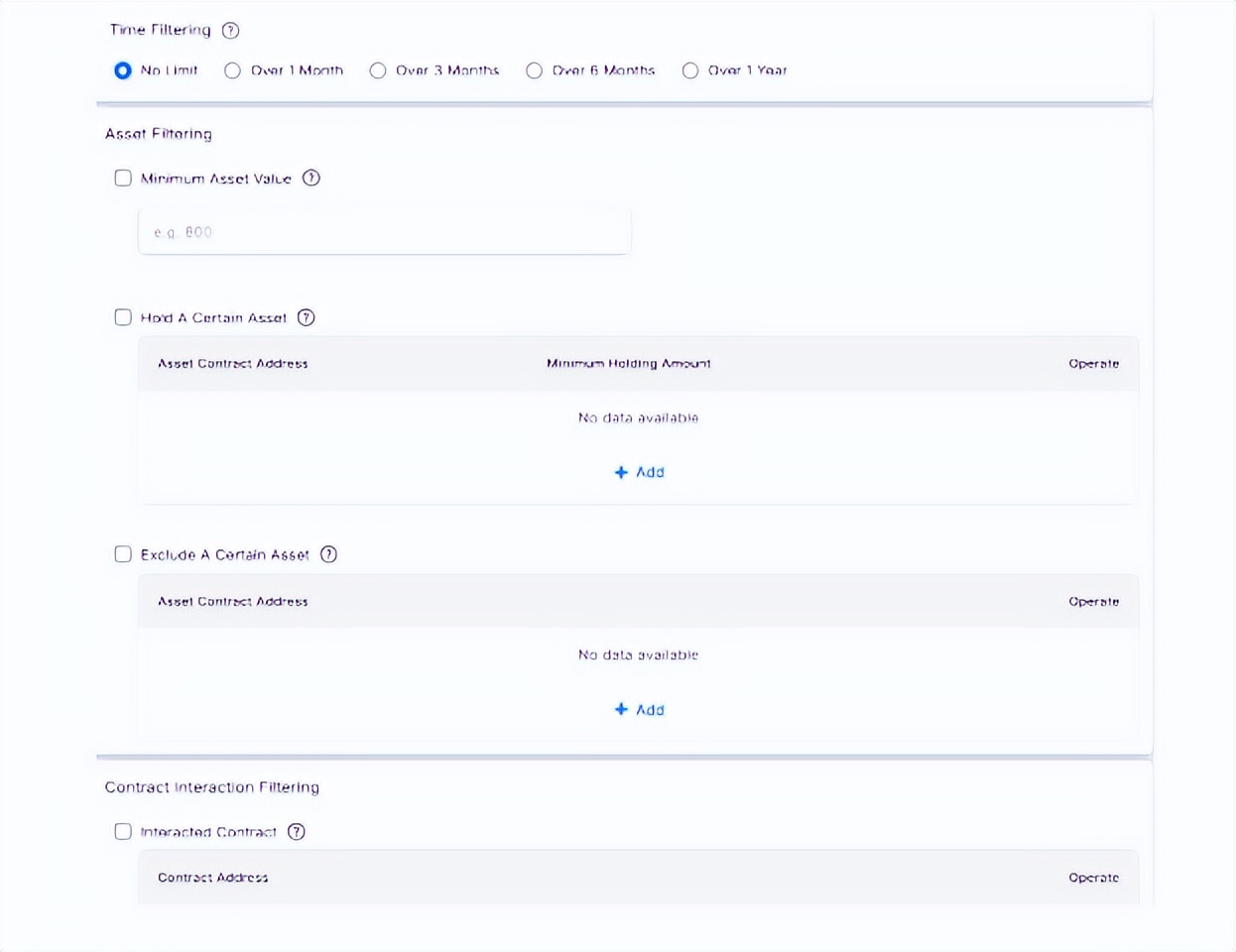 Creditlink 提供功能强大且灵活的批量地址过滤系统,用户直接上传 txt 文件批量导入钱包地址,并结合多维度条件实现高效筛选与分析。支持的核心筛选维度包括: