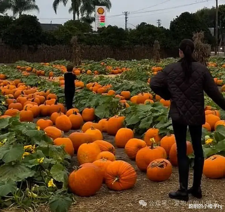 最像映入眼帘的就是穿着黑色羽绒服的梅根拉着拖车的南瓜,车上有着四个硕大的橙黄色的大南瓜,这是美国的特制南瓜,专门为万圣节的南瓜灯制作培育出来的。
