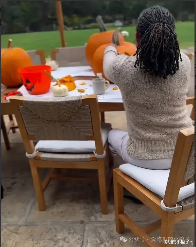 视频中多数的都是梅根与孩子们的合照,以及摘南瓜过程中的欢乐,而在最后,一位扎着一头辫子的妇女坐在花园的凳子上,精心的雕刻着南瓜,这是制作南瓜灯的最后一步。