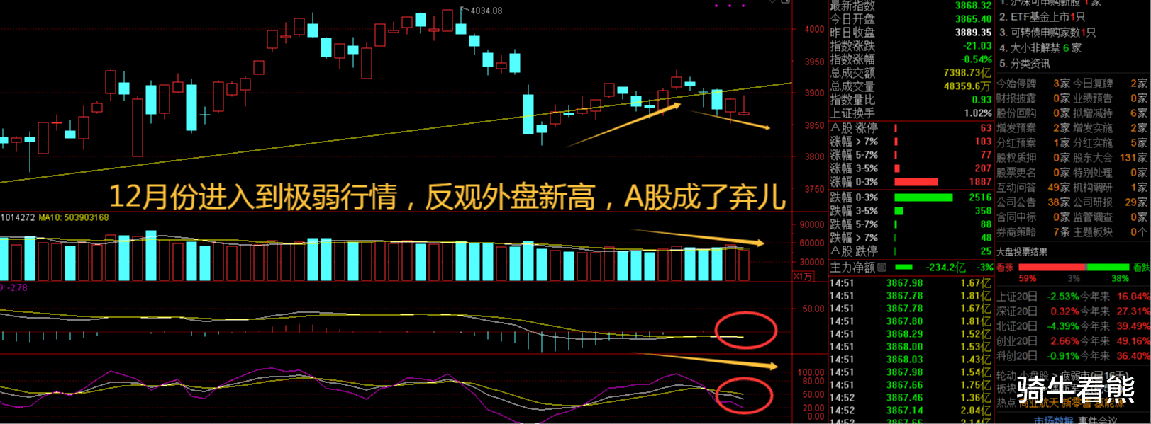 全球金融市场依然是在走历史新高的路,不出意外圣诞节前还有“喜报”,这也是年内美联储3次降息后的常规路线,2026年再降息大概率要上60000点了。反观A股3700点保卫战、3900点保卫战、3900点保卫战、4000点不是梦!已经进入到明显的“跟跌不跟涨”的走势,这样的行情也说明资金在不断抽离寻求更好的赚钱标的。再看看12月,这个月真的太难受了,外盘不断新高,A股却在11个交易日,其中有9个交易日盘中出现了超3000股下跌,有6个交易日盘中出现了超过4000股下跌,绝大多数资金都没有活路,哪怕是游资也是踩着“兄弟们”的肩膀往上爬!