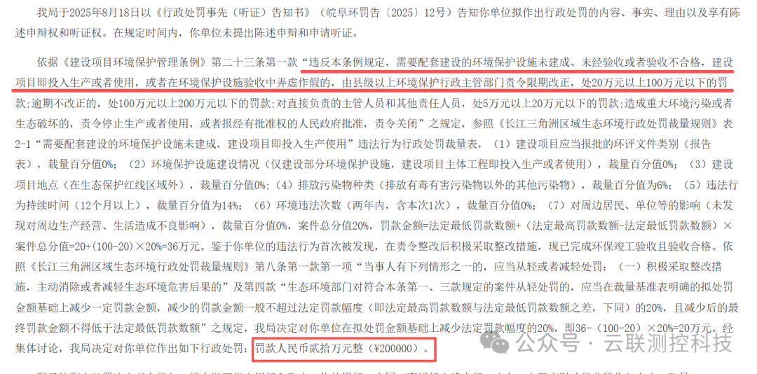上述单位违反《建设项目环境保护管理条例》第十九条第一款,未验收即投入生产使用。依据该条例第二十三条第一款及《长江三角洲区域生态环境行政处罚裁量规则》表2-1,经裁量(建设项目环评类别、设施建设、地点、污染物种类、违法持续时间等,总分值20%),拟罚款36万元。鉴于你单位首次违法,积极整改且验收合格,依《长江三角洲区域生态环境行政处罚裁量规则》第八条第一款,从轻处罚,减少法定罚款幅度20%,最终罚款20万元(¥200000)。