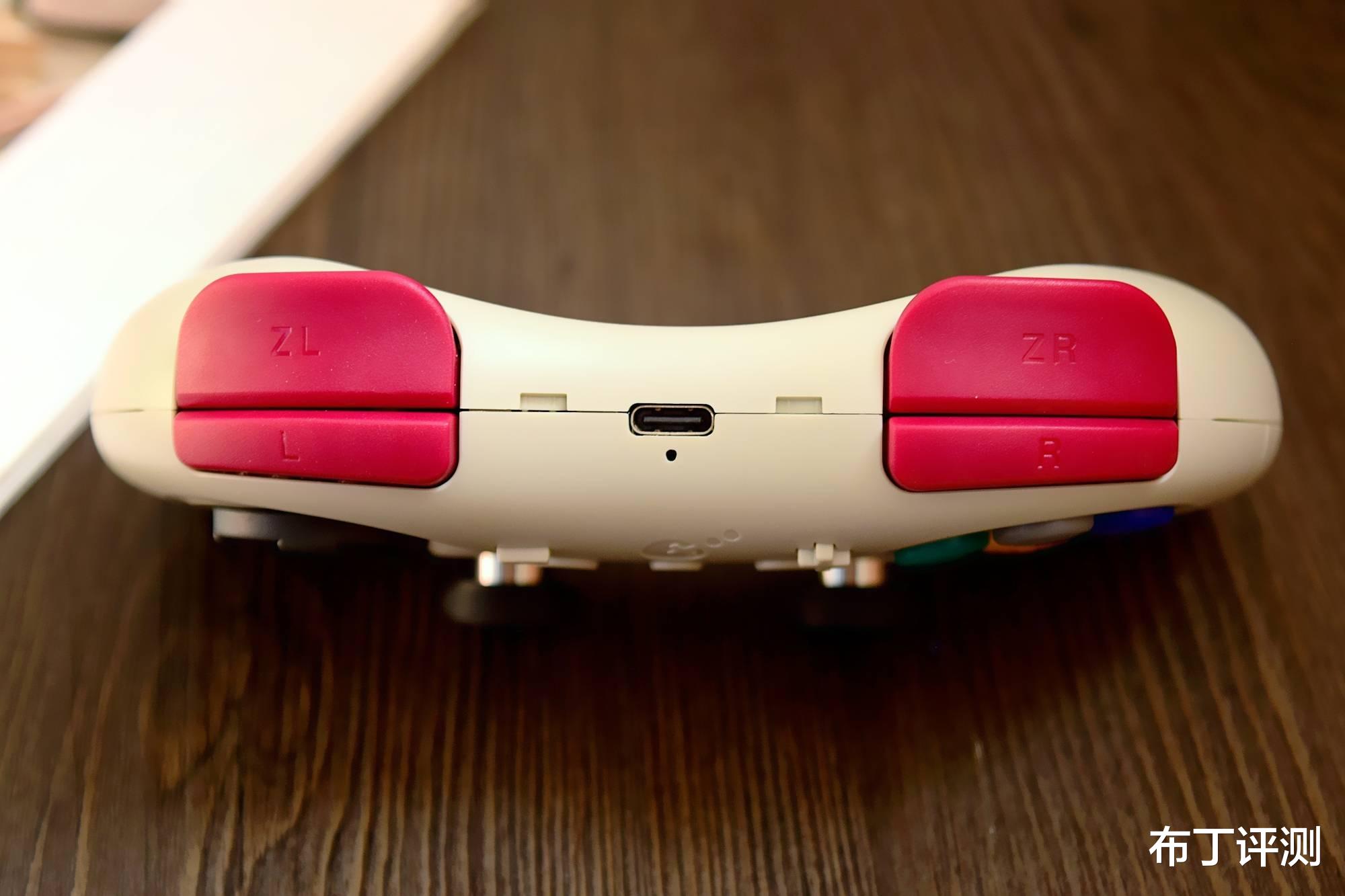 在手柄顶部还配备了L键、ZL键、R键、ZR键共4个肩键,对于喜欢玩射击类游戏的用户很实用。在按键中间位置是Type-C接口和充电指示灯,其中充电时指示灯为橙色,充满后显示绿色。