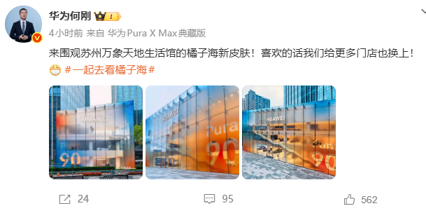 PChome注意到,今日,华为终端BG首席执行官何刚展示了苏州万象天地生活馆的改造效果:门店玻璃幕墙采用与Pura 90 Pro Max主推色“橘子海”一致的橙蓝渐变配色,并印有“Pura 90”字样标识。该设计通过AI技术生成,旨在呼应新机配色美学,提升线下体验氛围。同时,何刚并表示“喜欢的话我们给更多门店也换上”。