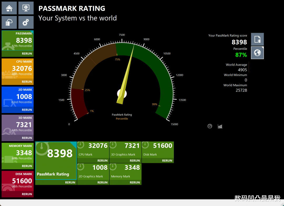 在PerformanceTest中,整机得分8398,领先度为87%,作为一款两千多的小主机,这个成绩还是挺亮眼的。