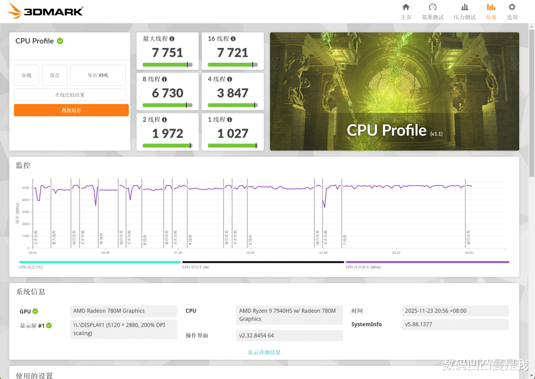 3DMark测试CPU,单线程得分1027,最大线程得分7751。