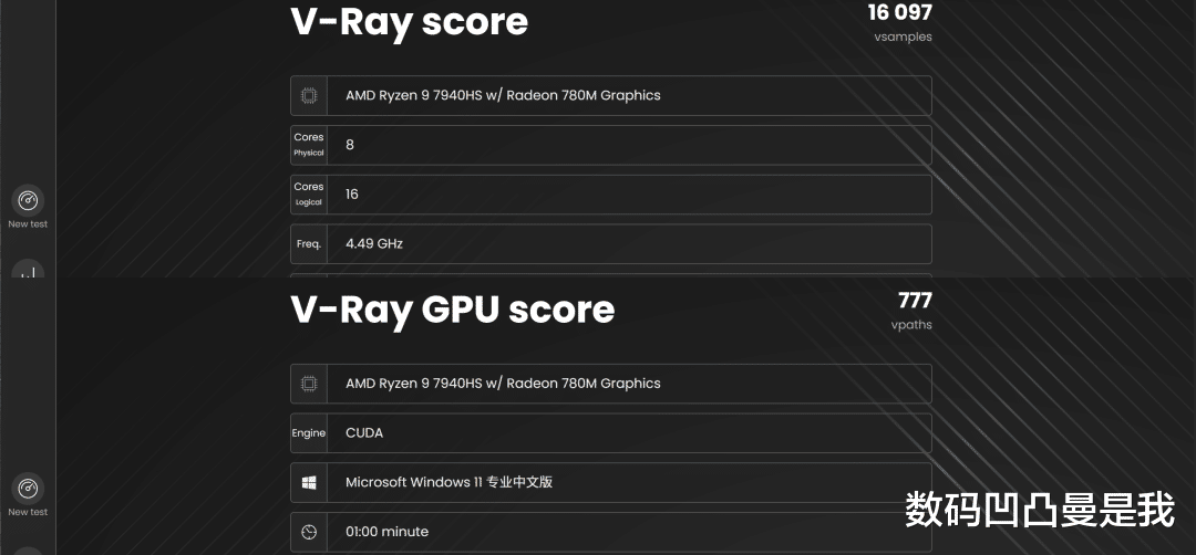 在V-Ray渲染引擎测试中,CPU性能结果为16097分,GPU采用CUDA引擎,测试结果为777分,可以看到CPU表现不错,但核显性能确实一般。