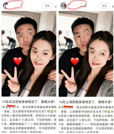 多名网友也分享了自己的遭遇,有用户在武汉、上海两地的账号中均刷到同一对“AI夫妻”的装修帖,还有用户私信获取推荐名单后,不仅未得到有效信息,反而遭到十几家装修公司的轮番私信和电话轰炸,不堪其扰。