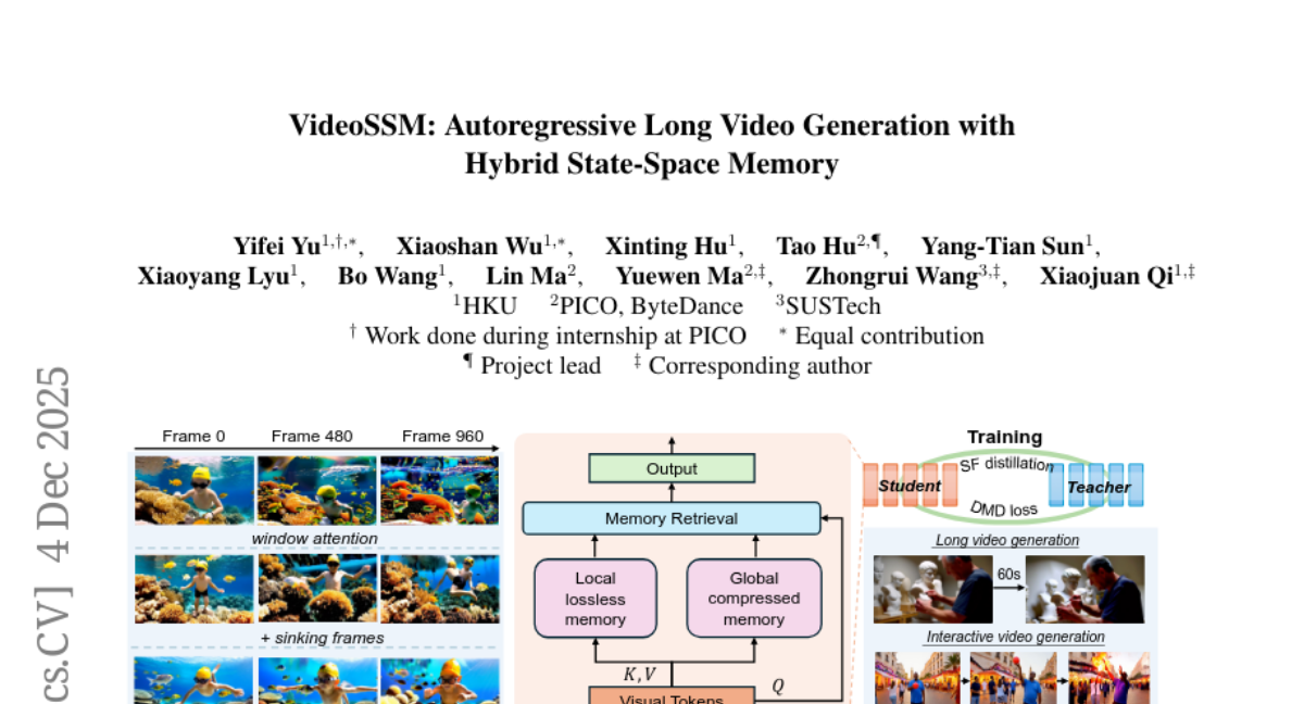 当前的AI视频生成技术就像一个健忘的导演,拍摄几分钟后就开始忘记故事的开头,导致画面变得混乱、角色面目全非,甚至开始无限循环同样的动作。而这个团队开发的VideoSSM系统,却能像一个经验丰富的导演一样,即使拍摄一小时的长片,也能完美记住每个角色的特征和故事的脉络,让视频从头到尾保持惊人的一致性。