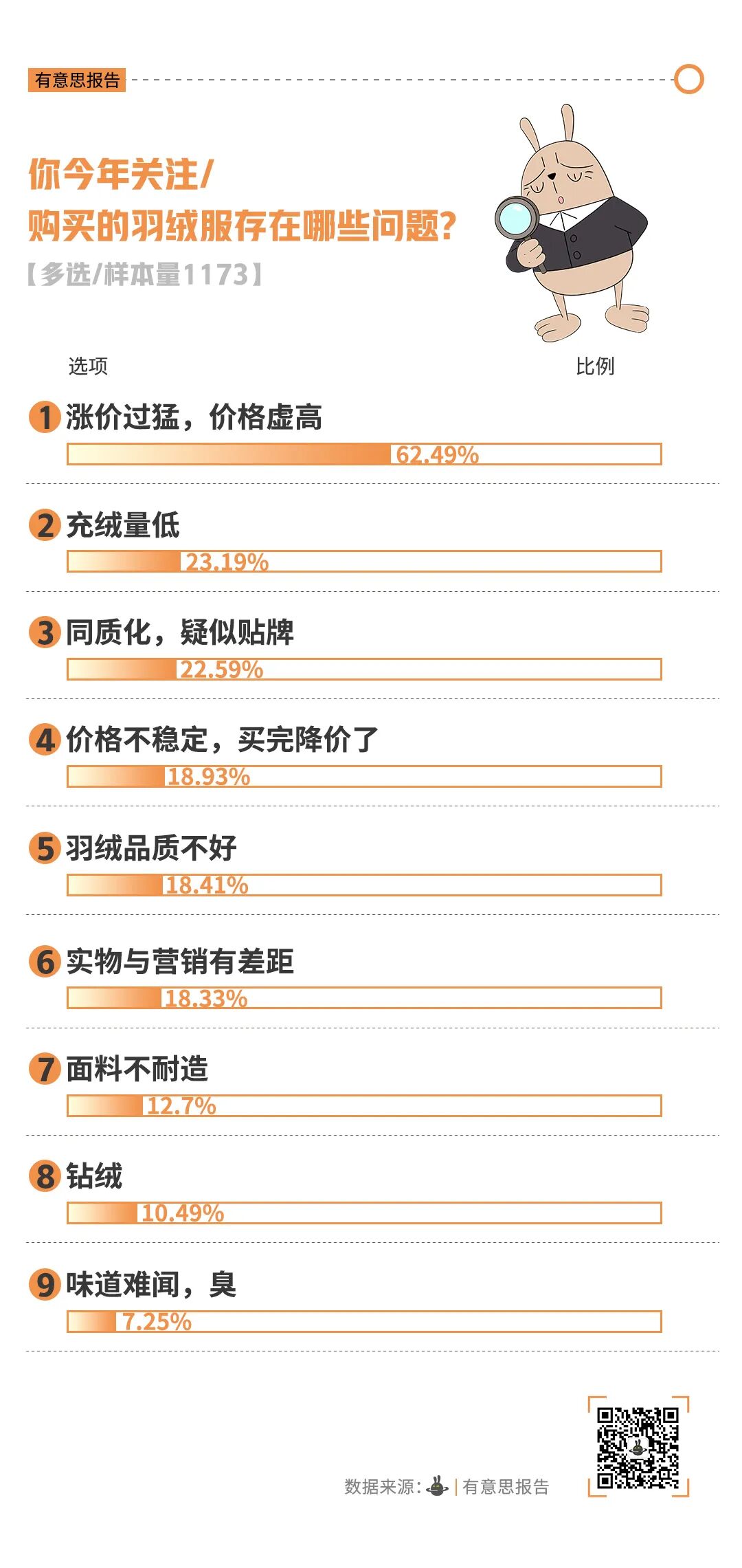 映射到消费端,尽管消费者愿意为高品质羽绒服支付溢价,但对市场存在的问题同样有清晰认知。调查显示,“涨价过猛,价格虚高”是最突出的痛点,有超六成消费者选择此项。“充绒量低”和 “同质化/疑似贴牌”等问题也高居榜单前列。尤其是预算在 2000元—2500元区间的消费者,对 “同质化”问题的关注度明显高于其他群体,同时他们也更强烈地感觉到该价位段产品的 “价格不稳定”。