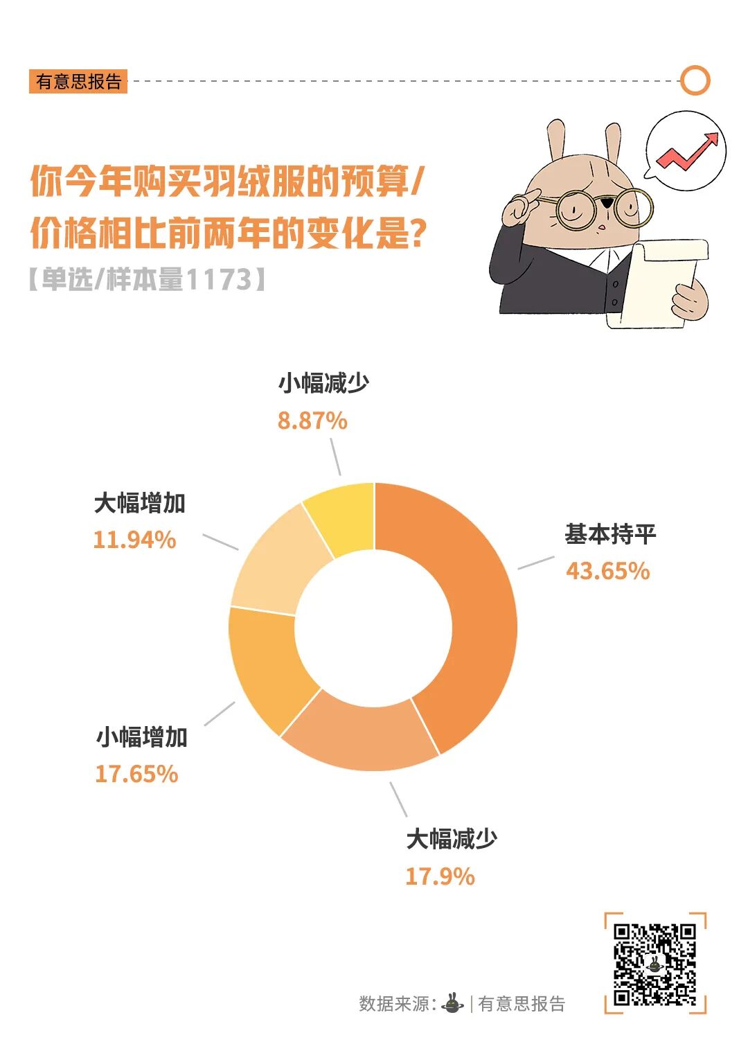 具体到预算,尽管“基本持平”仍是近半数消费者的选择,但愿意增加羽绒服开支的人群正快速扩大。调查显示,今年计划提高羽绒服预算的消费者占比近30%,去年仅7%。