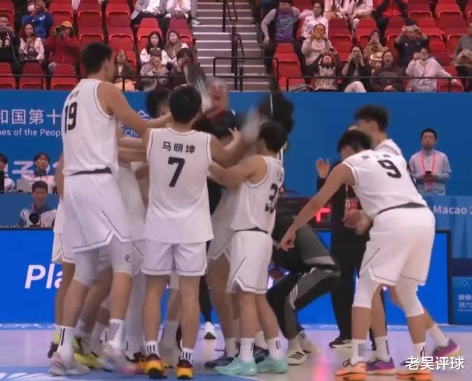 赛后,广东U22男篮围绕在一起疯狂庆祝,他们还把主教练郑永刚抛向空中庆祝。