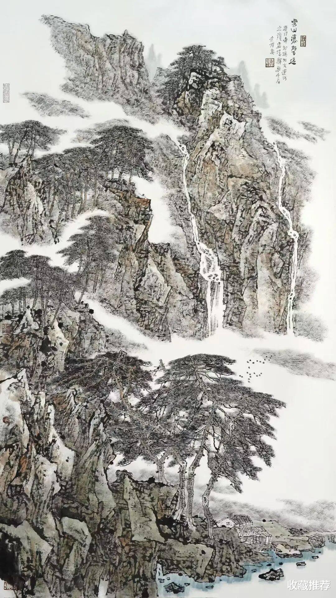 细看定煜老师的山水画作品,画面气势雄壮,山霭迷转,苍松翠柏如黛,飞瀑流泉如银。群峰竞秀,空壑幽深,茅屋临水,瘦石寒梅染夕曛,在这里,唯有琴声长伴归隐的读书人。这些都是太行山水的真实写照和浪漫升华,其意境恰好与定煜老师的斋号《驻云居》契合。
