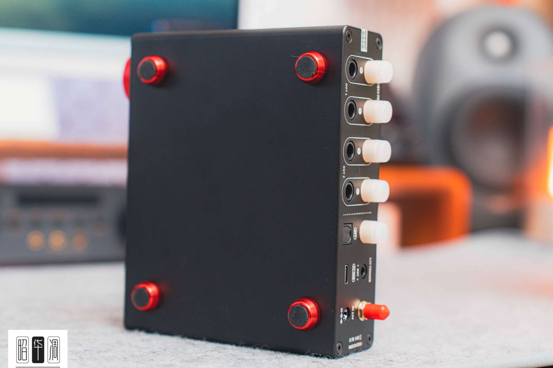 ▼右侧那颗硕大的红色铝合金电位旋钮极其吸睛,在整体黑色的沉稳机身上点缀出 一 抹狂野的激情。中间预留的耳机接口非常实用,意味着它不只是 一 台解码,更是 一 台随时能驱动耳机的桌面中心,省去了额外接耳放的繁琐。