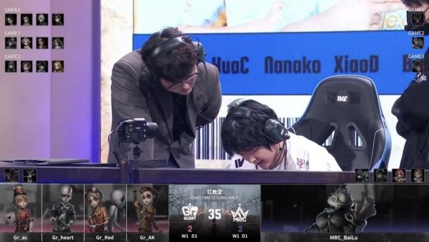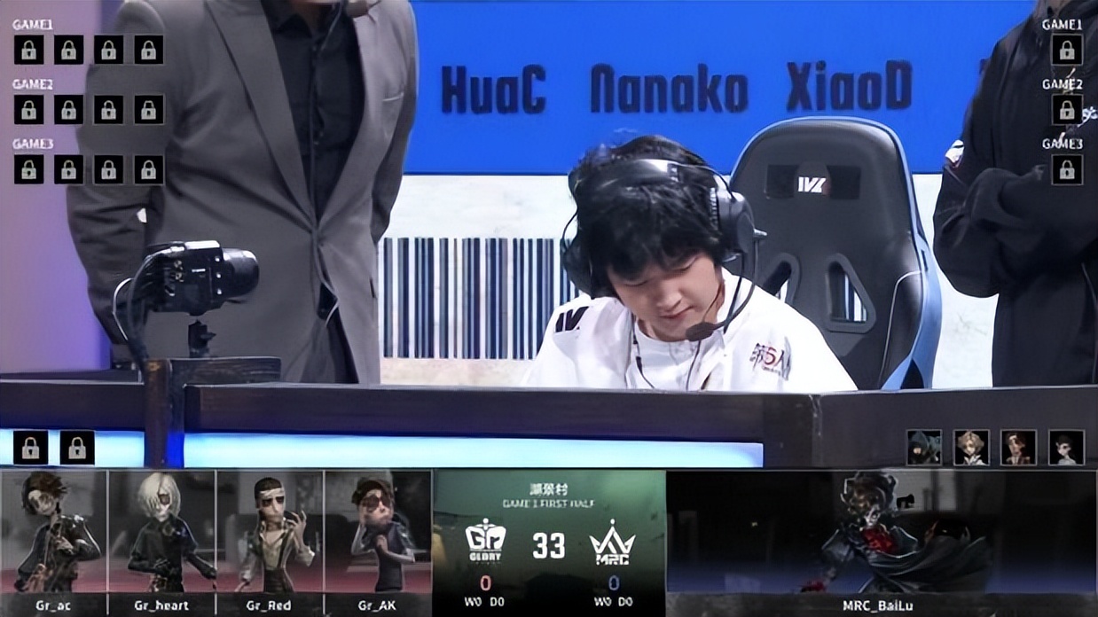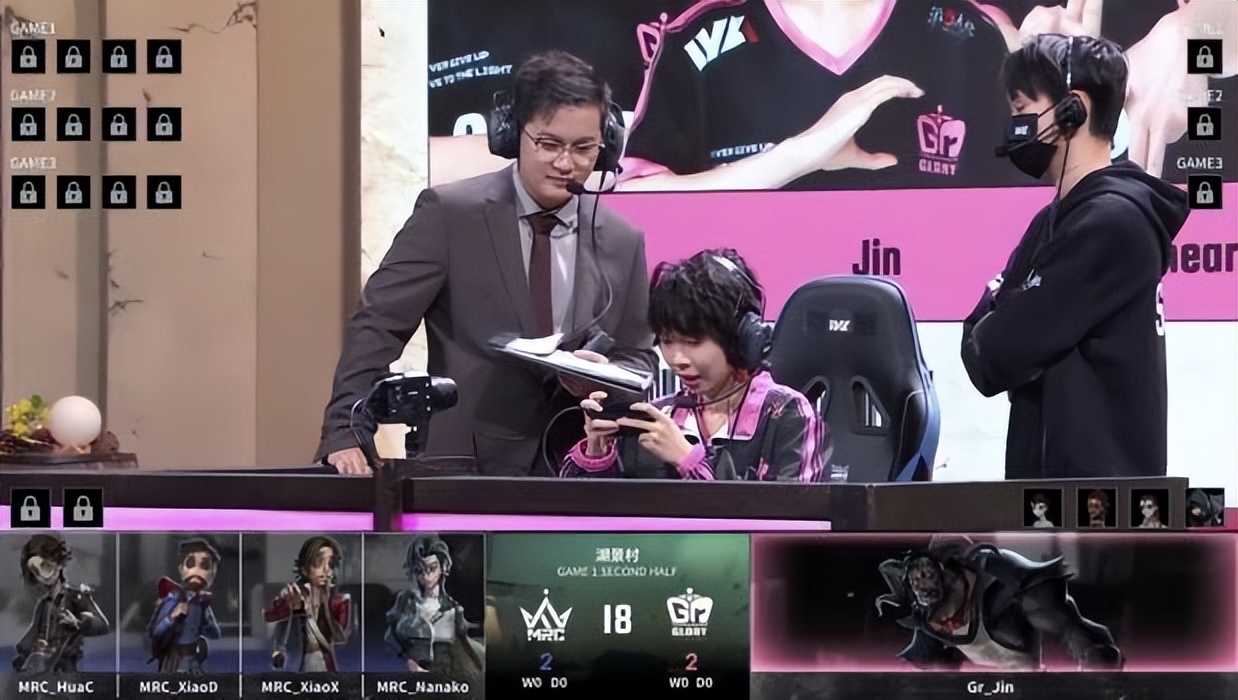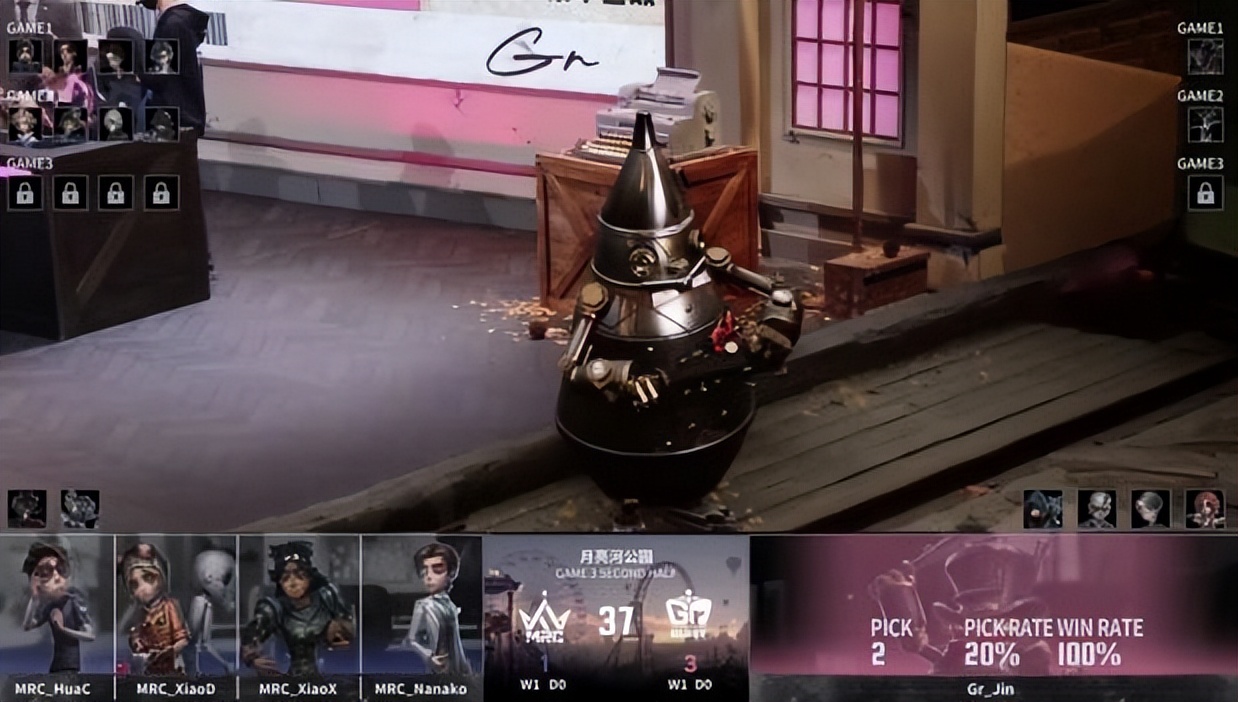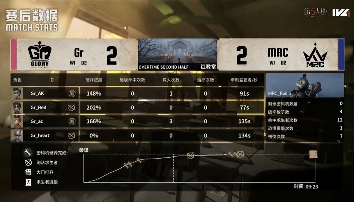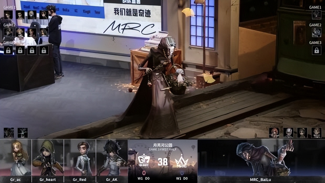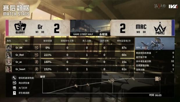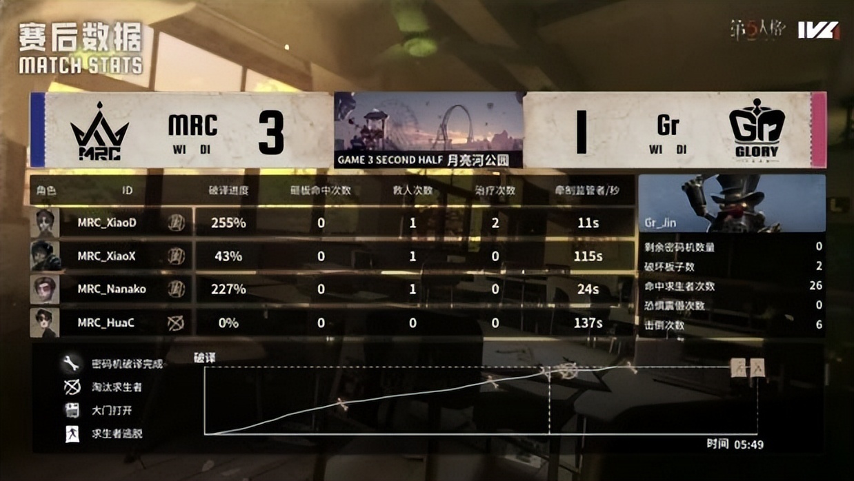 Gr的求生者选择了邮差、机械师、空军、“逃脱大师”(BAN“跛脚羊”、时空之影);MRC的监管者BaiLu选择了“记录员”。(BAN先知、前锋、弓箭手、杂技演员)