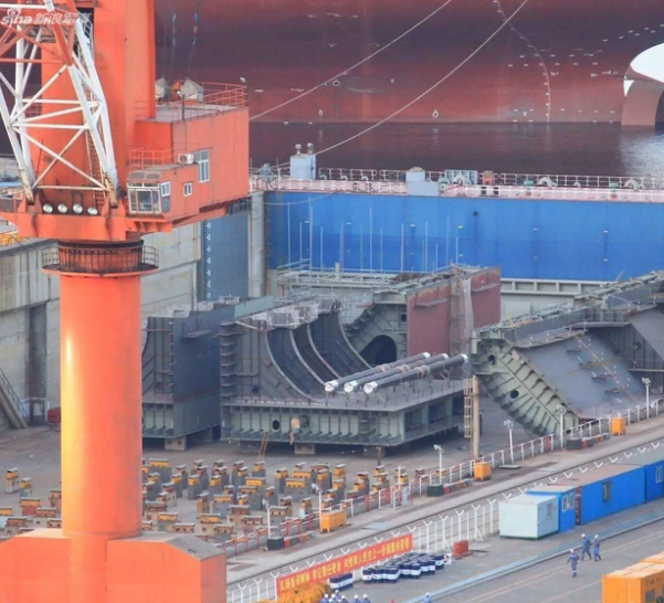 这个航母船体已经搭到150米长,里面装着两个超大的金属框架,尺寸跟美国的核反应堆舱一模一样。