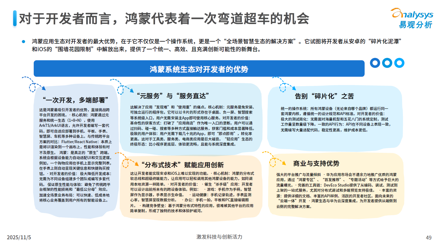 流量保障:鸿蒙生态重新定义流量入口。它采用新的分发模式:应用市场给了创新应用更多的曝光机会,编辑推荐模式也会倾向于独特的应用;而元服务可以嵌入到系统的各个焦炉,成为新的、更高频的流量入口。