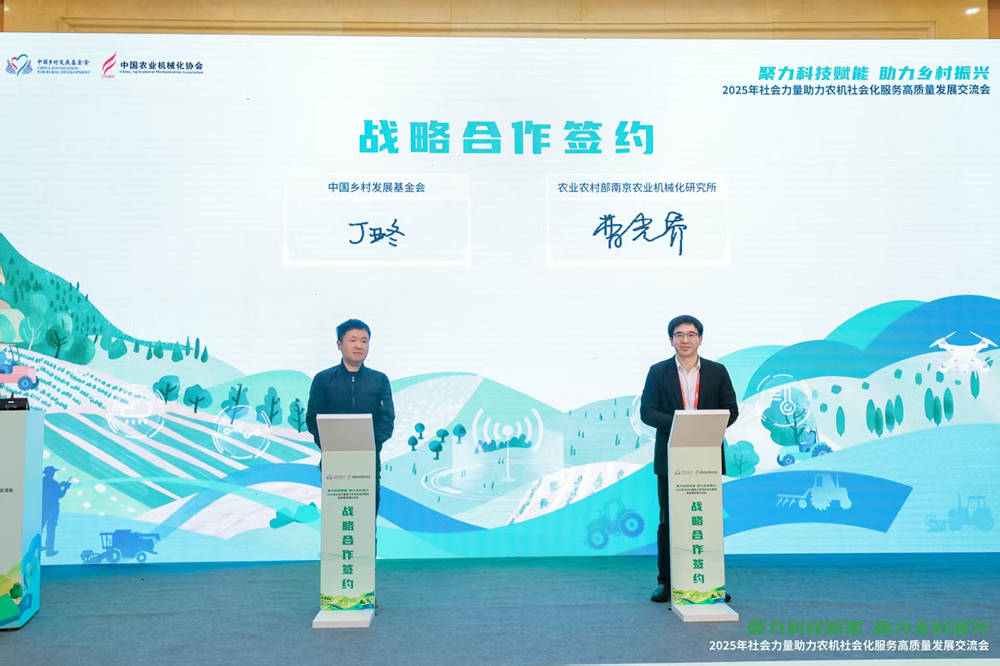 中国乡村发展基金会副秘书长丁亚冬、农业农村部南京农业机械化研究所副所长曹光乔,共同签署乡村振兴战略合作协议。双方将围绕丘陵山区现代化农机装备推广应用、专家技术服务、社会化服务主体培育等方面展开合作,为项目注入更强科技动力,为欠发达地区的新农机发展提供技术支持,并着力打造一批可复制、可推广的丘陵山区农机社会化服务案例。
