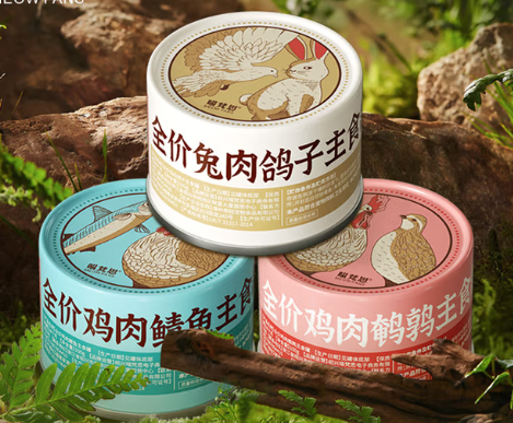4.喵三餐猫罐头猫罐头最好的牌子测评:喵三餐是与知名宠物用品品牌拜卡深度合作的品牌,专注于宠物食品的生产。他家主食罐头有鸡肉、牛肉、鸭肉、三文鱼、兔肉5种口味,5种冻肉打底,然后是水、鲜鸡肉,还添加了冻带骨鸡肉、冻内脏、冻鸡软骨。功能性营养添加剂种类多样,包含牛磺酸、果寡糖和多种维生素、矿物质。金属罐包装,色彩鲜明且方便区分口味,背景是自然风景插画,直观传递“贴近自然饮食”的理念。